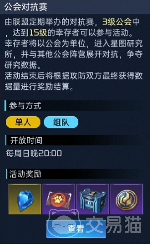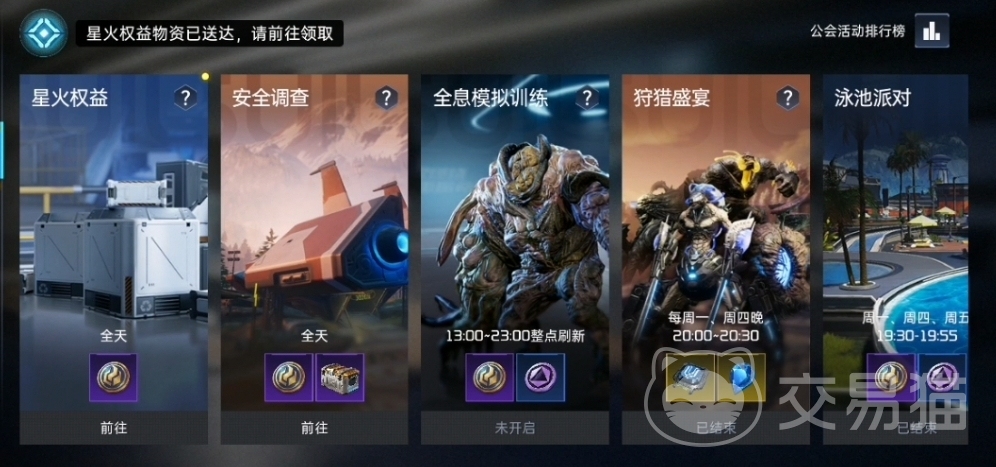参与星火权益、狩猎盛宴、安全调查、荒诞游戏、全息模拟训练和公会对抗赛。参加公会活动,幸存者可以获得公会贡献,公会可以获得公会繁荣度和公会资金。狩猎盛宴成功击败首领、荒诞游戏成功解救人质以及公会对抗赛取得胜利都可以获得额外红包奖励,其中狩猎盛宴击败首领越多,可分得的红包总额越高哦!