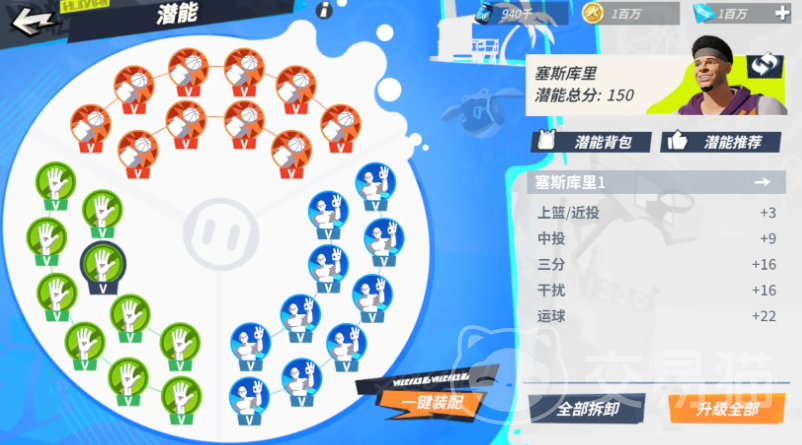 潜能加点,有红、绿、蓝三个部分,根据球员的特点来选择合适的潜能,通常也是提升属性、干扰之类的能力。举个例子,周长是一个三分和突破都挺不错的球员,加点方面红色的就可以选择“自走炮台”来提升3分与运球,绿色的部分选择“多重分身”来提高防守稳定性与干扰能力,要是想进一步提升进攻的话就用“游击战术”。蓝色的部分则选择用保护措施、金手套。