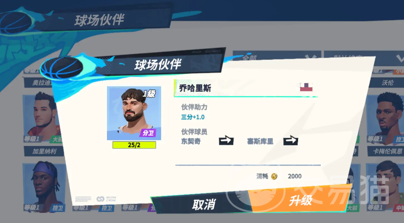 伙伴,有点像是装备卡,也能提升球员的属性,每个球员可以搭配2个伙伴,伙伴并不会上阵和你一起打球,只是提供一些属性加成。伙伴也能升级得到更多的加成。例如塞斯库里擅长投三分,那么可以选择能够提供三分属性加成的乔哈里斯,另一个伙伴可以选择用马库斯斯玛特来加抢断属性,让塞斯库里对外线的逼抢上有所长进。
