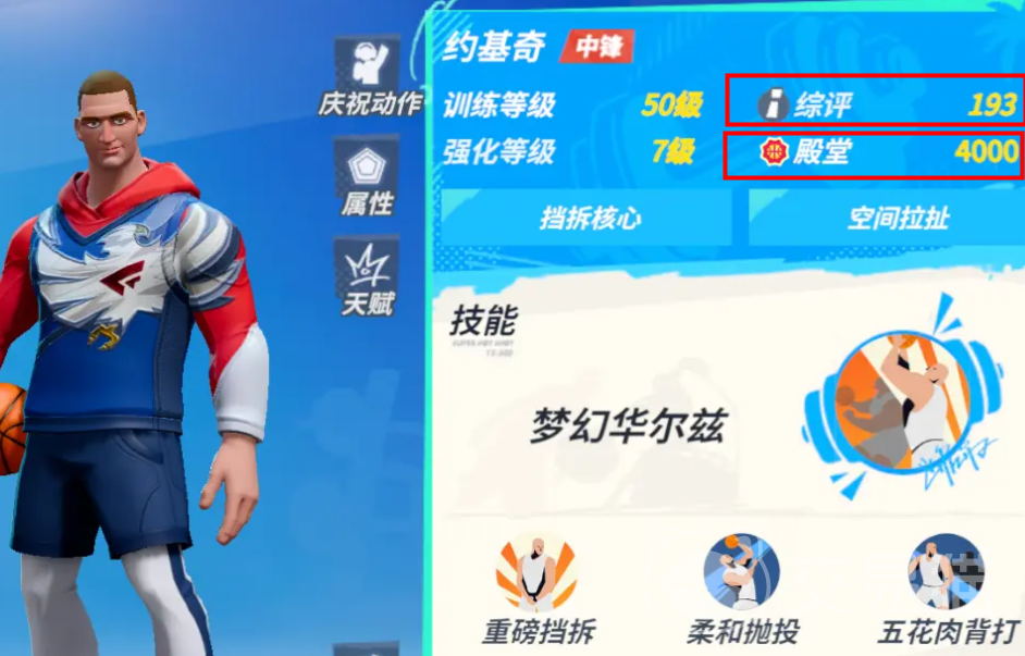 然后在右边还有综评、殿堂这种描述,这部分的数值与描述是会随着你的球员养成水平以及个人使用熟练度而变化的。例如综评一开始差不多是在70~80左右,厉害一点的能到90,某种程度上说这个初始综评能稍微体验一下球星等级。后面的殿堂则是熟练度,初始都是菜鸟。