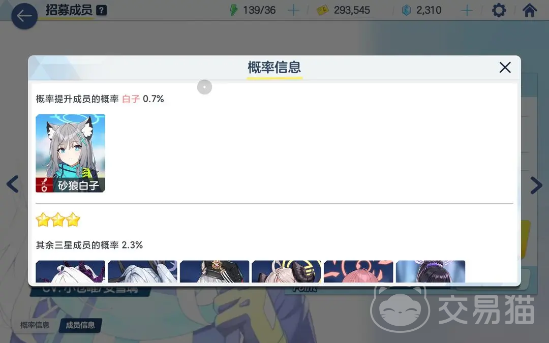 游戏中的角色是有星级定位的,玩家们在新手卡池中抽取到三星角色的概率是在0.7%,1星卡牌的概率是60%左右,而其他限定卡池的话会提高1.75%的 三星的概率,玩家们在使用其中一个卡池的时候,如果抽奖的次数达到了200次的话,那么就可以在商店中兑换一个角色,商店每天都会刷新,玩家们看着选择就好了,但是比较推荐玩家们选择【伊织】。