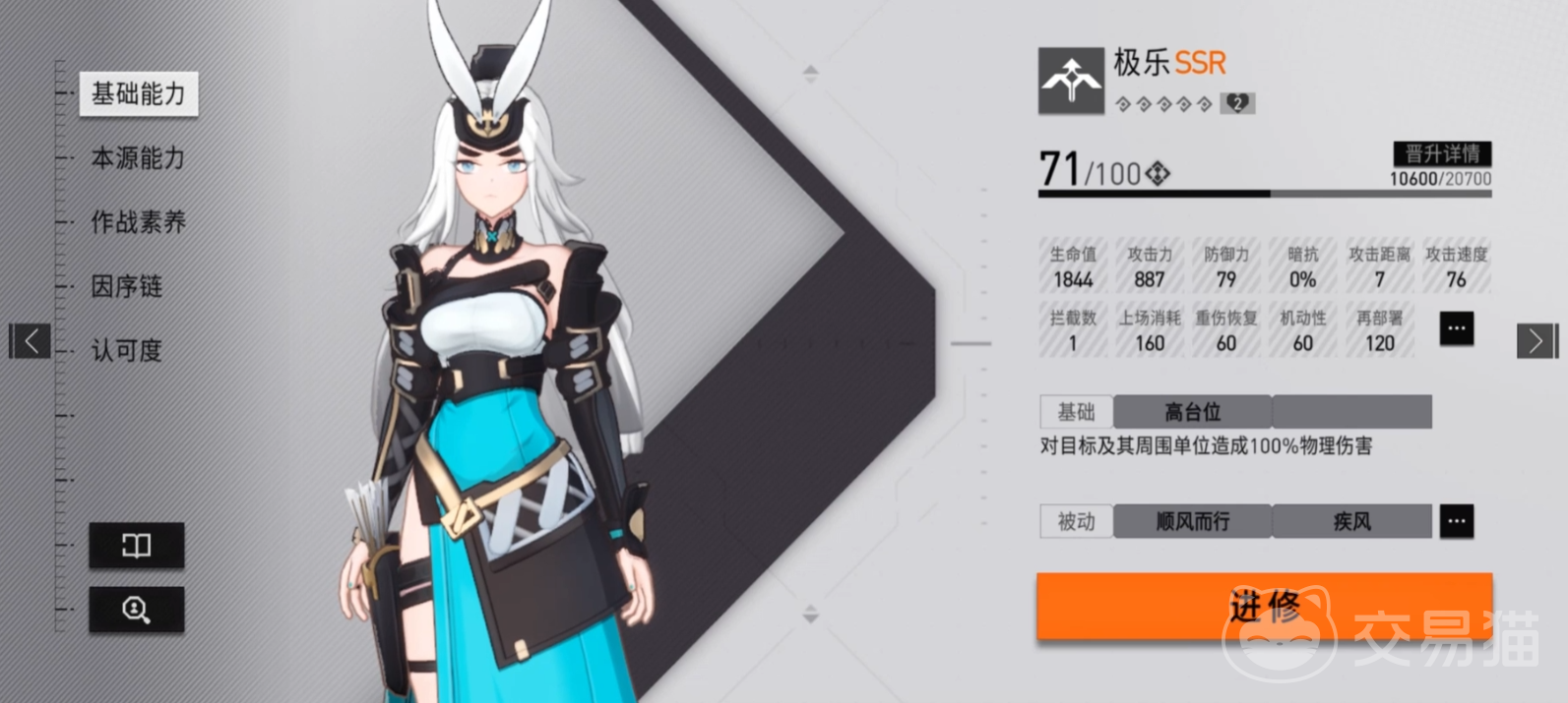 极乐的作战素养叫做“破风”,在使用其作战素养技能之后,极乐会失去aoe伤害的效果,普攻只能对单体攻击,但与此同时,她的攻击范围会增加,攻速会下降,此时极乐会锁定自己攻击范围内攻击力最高的敌人,并且在对其攻击的时候无视对方部分防御力。