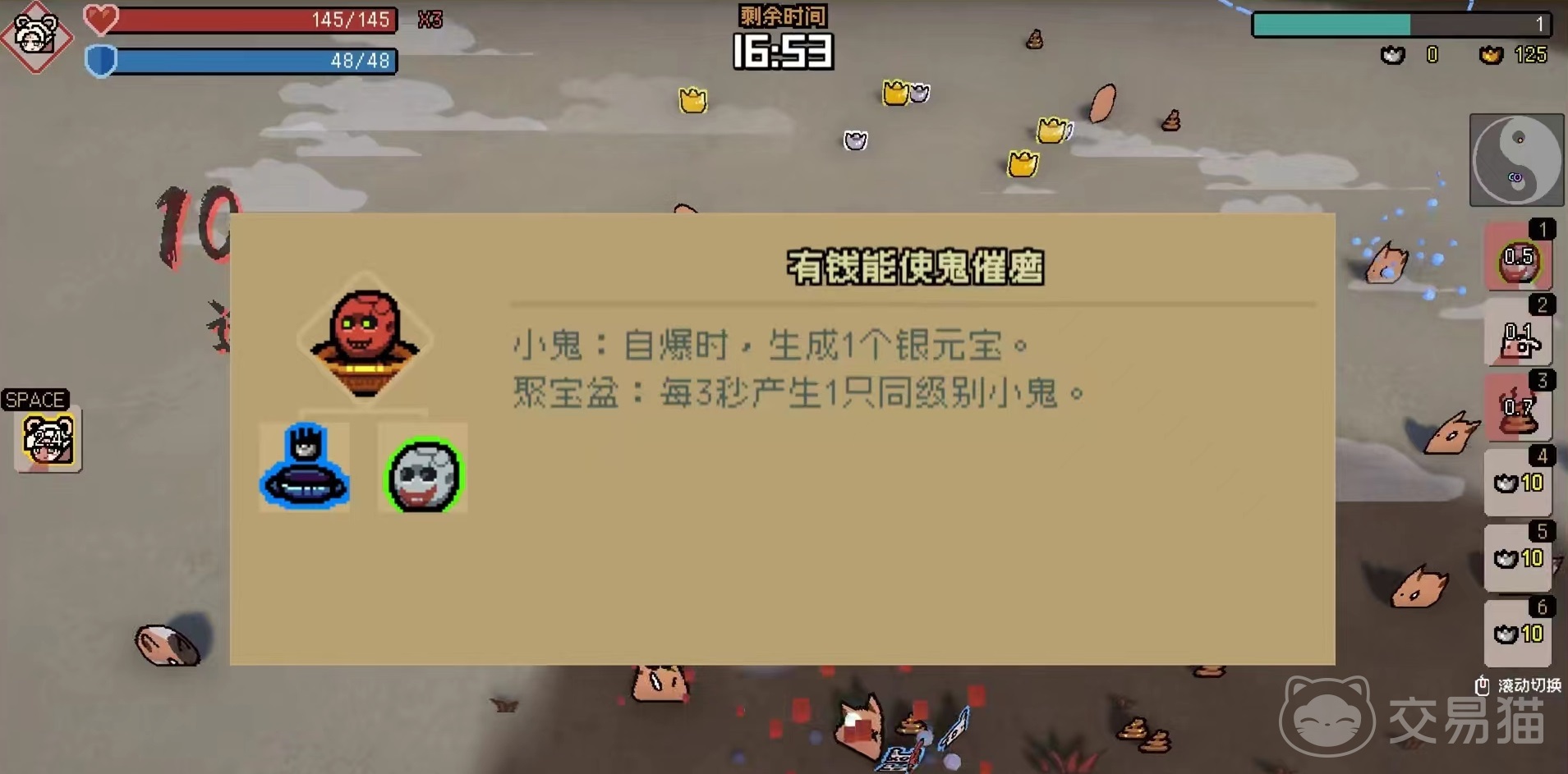 首先要了解的是该角色主动技能,会将周围召唤物吃掉,并且随机获得属性,主要包括会心、阴魂等,所以提升核心关键就是快速进行大量召唤,然后利用主动技能吃掉,这样往复循环自产自销。小编首先推荐的就是有钱能使鬼推磨玩法,采用的是小鬼和聚宝盆组合,小鬼自爆时能产生一个银元宝,而聚宝盆每三秒就能产生一只同级别小鬼,这样召唤物数量直接就多了起来。提供了大量输出和银元宝。