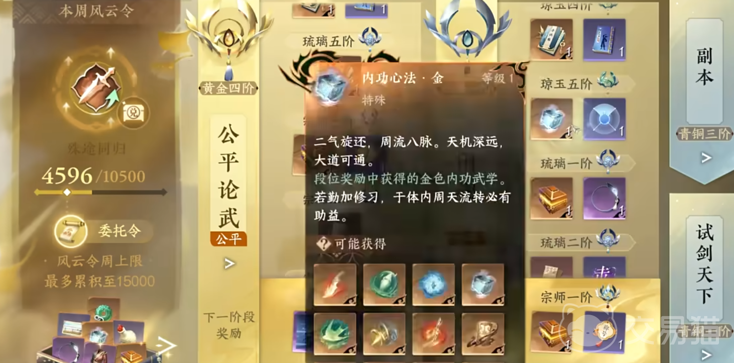 打开竞技奖励,段位黄金一阶、琼玉三阶五阶,均可获得随机稀有内功,到达宗师一阶,可以获取自选稀有金色立功的宝箱。前期玩家PK都是人机,大家可以挑个上分段冲宗师。页面里其余的副本、闲趣与试剑天下,到达对应段位也同样奖励金色立功,4个玩法里面选取段位最高的两个玩法派发奖励,所以即使是休闲种田流玩家也可以拿满奖励。