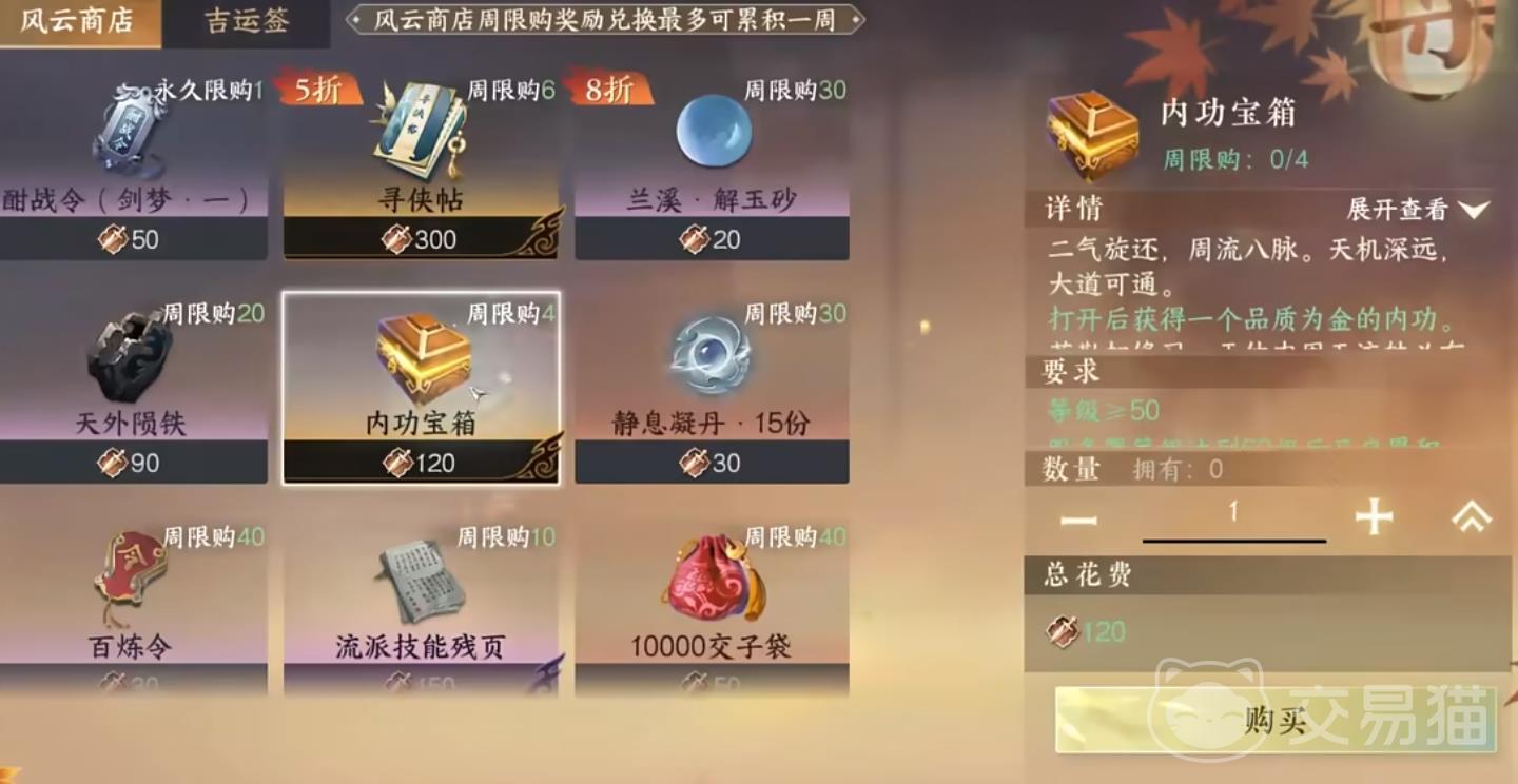首先是打开集市里面的风云商店,每周限购4个内功宝箱,每个宝箱可以开出一个品质为金的内功,这是玩家最基础稳定获得金内功的途径。