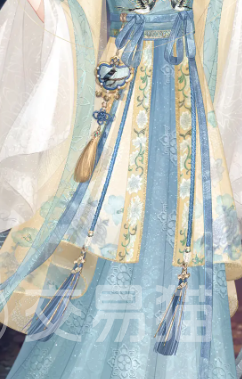 这两只喜鹊是非常有寓意的,另外裙子的下摆处还有一个香囊挂饰,这个挂饰上印着的图案也是喜鹊,最下方腿部的位置是用的纱布质感的绿色的布料,看起来也是非常好看的,服装整体风格上十分符合七夕主题。