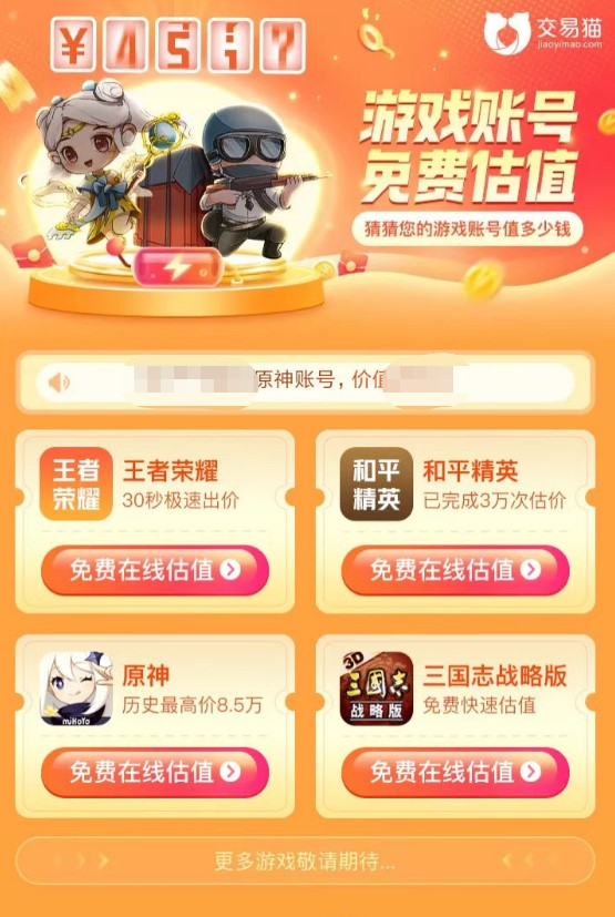 我们想要出售自己的闲置账号的话,不难免的要为账号制定一个合理的价格,从而保证手里的账号能够顺利的出售出去。但是就这一步,看似很简单,其实难道过不少玩家。因为他们大多喜欢随意的凭借自己的感觉,就为账号制定价格,然后导致账号的价格区间在相同类型的商品账号中不具备竞争力,然后无法成功出售。对于这种自身不怎么具备专业估值能力,却又想出风头,较真自己的标价正确的玩家,小编也不想多说些什么,希望大家不要效仿。如果大家对于自己判断的价值没有信心的话,就可以借助交易猫平台的帮助,由平台专业的人员帮助大家为你们的账号制定合理的售价,而且像王者荣耀这游戏,该平台还支持免费估值的服务,既不花钱,又能有专业鉴定,何乐而不为呢。