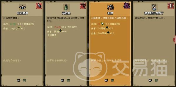 刺猬可以将大家在游戏中召唤的数量得到翻倍效果,猛牛效果与其相似,两者相加可以获得召唤小成的效果,飞刀在使用的时候可以对攻击到的敌人造成5%的吸血效果,而且它的伤害会随着等级的提升而增加,木锤的效果可以随着等级的提升而从增加攻击方向,最多可以从十个方向发射,并对敌人造成攻击,两者相加可以获得刀锤之交能力。