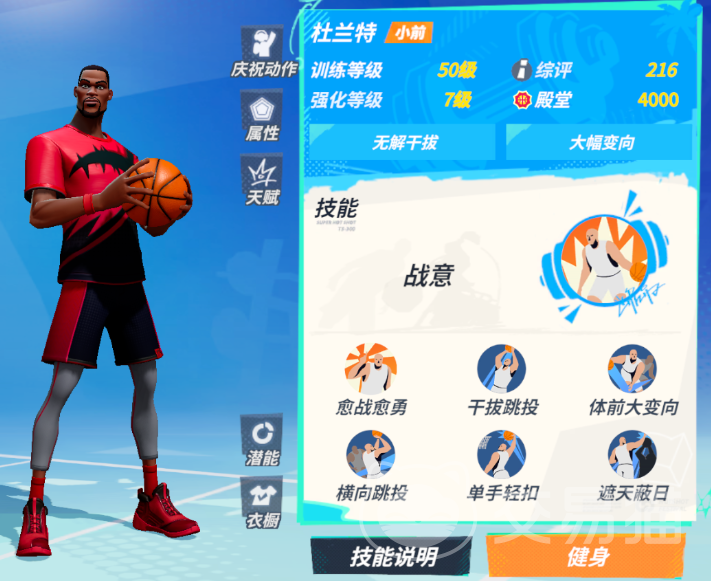 小技能这块他有四项都是为进攻服务的,其中干拔跳投可以出其不意直接起跳投篮,快速的出手速度往往能打得敌人措手不及,被战意强化后它更是会转变为更加难以封盖的后仰投篮。