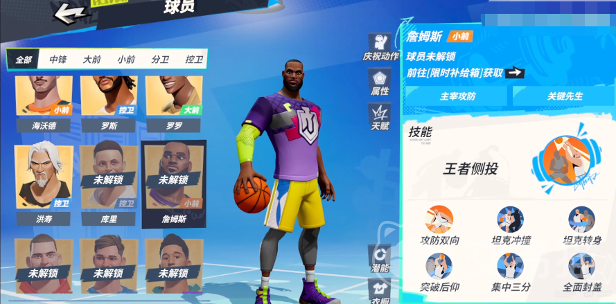 詹姆斯:该球员是一名非常全能的小前锋,游戏内他有着顶尖的扣篮属性,力量和控球也同样不逊,其中核心技能开启后,可以令其在无干扰情况下轻松命中高难度的侧投,而被动攻防双向则可以同时增加他的防守干扰效果,以及三分的命中率。