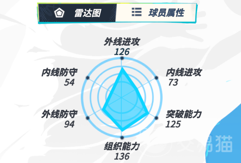 首先从雷达图来看,东契奇是一位偏向组织和外线进攻的角色,其中前者的能力值高达136,这就意味着他的传球肯定是不错的,然后旁边的突破能力也有125,说明控球和过人也有一手,至于126的进攻这多半是说他还具备不俗的远射能力。