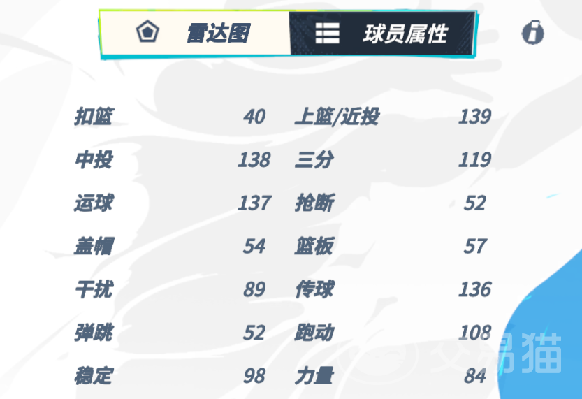 再看具体属性的话,可以发现东契奇的上篮/近投这一项是最高的,这意味着当他突入到篮筐附近时会有着很高的命中率,另外138的中投和137的运球也使其完全拥有运球后投篮的能力,虽然在离篮筐远了之后这种能力会也有所下滑,但投进三分还是没什么问题的,毕竟119的三分属性也摆在那里。