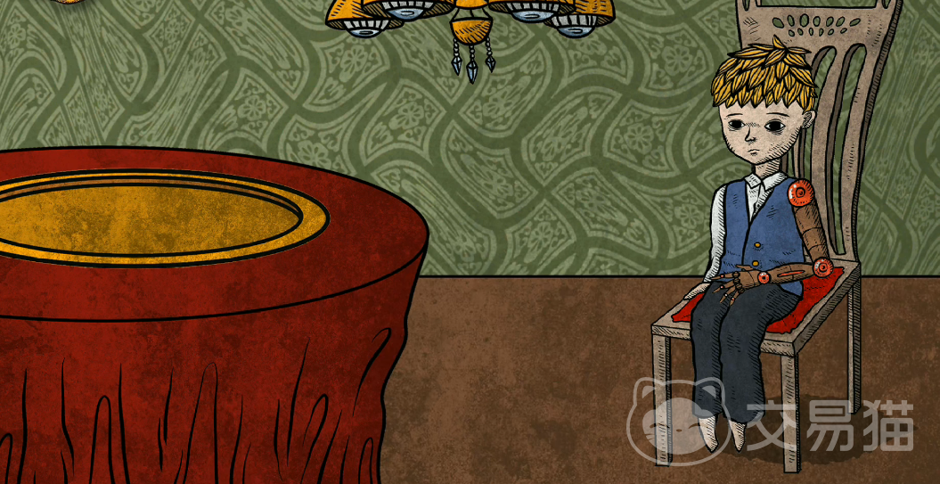 而这张图上面大家就可以看到弟弟的缺陷就是在手臂上,椅子上面坐着的弟弟身上没有手臂,而在画面左边有一个红色的圆桌,在圆桌上面有一个金黄的圆盘,圆盘里面里面装的就是一个义肢,拖动义肢给弟弟安装好之后大家还需要观察。