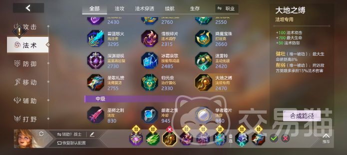 为了搭配上面的装备,大家还可以考虑一下原本马可波罗的移速,本身其实他的移动就已经是比较灵活的,这里在带上一个守护之翼,横穿地图也是完全没有问题,然后还可以带来一个比较容易触发剧毒效果的装备,这里可以选择的是大地之缚,这个装备让大家贴近敌人的时候会带来更高的输出。