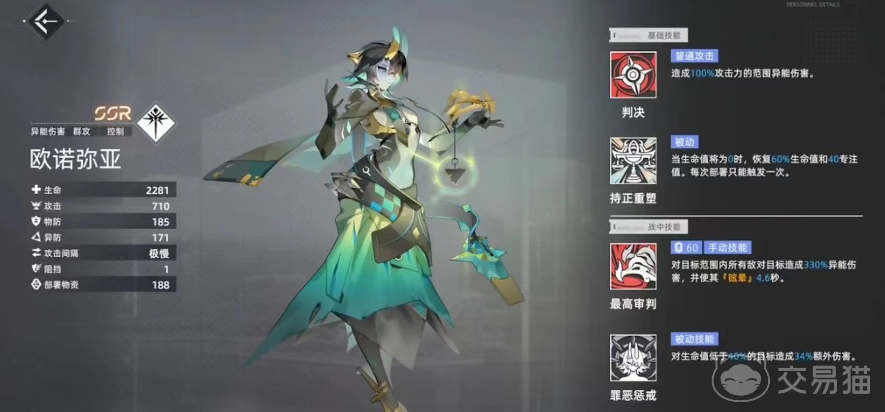 欧诺弥亚是一个SSR角色,可以看得出来等级是挺高的,输出能力及控制能力都不错,同时还拥有辅助的能力,所以不管是从品质还是稀有度这方面来看,都是非常高的,它的技能里面最好用的就是控制技能以及群攻输出技能,他的一技能能够在有限范围里面使敌人陷入到眩晕状态中,这样就可以很好的将敌人给控制住,二技能则是能够让角色自身的输出伤害提升,并且持续时间较长,在法师里面算是非常强的一个角色。