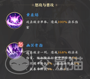 他本身属于法伤型源师,普攻是平平无奇的100%单体法伤,怒攻则是能够攻击一列敌人的“幽冥骨指”,它有着168%的伤害加成,同时在击中敌人后,还会附加命中,闪避,暴击和抗暴等多种属性的减益,并且最多可叠加三层!
