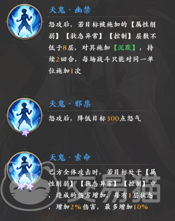 再者就是觉醒后所新增的天鬼系列被动,它们算是对幽寒阎罗系列被动的增强,怒攻施加的沉默可以在敌人debuff高于8层时就直接触发,此外,还可以对敌人降低300点怒气,同时升到两星后,还会令己方用全体攻击带有debuff的敌人时,获得最多10%的额外增伤。