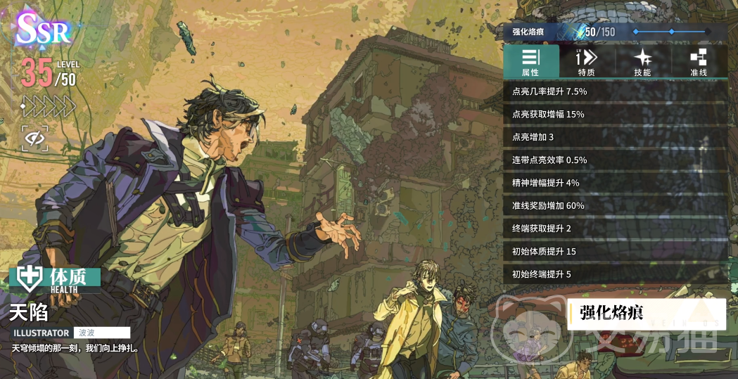 第三个叫做天陷的烙痕是基础比较一般的,但是这个烙痕的话大家可以给时事热点角色使用,而且带来的也是伤害提升的价值,如果使用它的话可以根据这个角色本身的属性伤害再提升额外百分比的效果,后期也可以利用蚀刻伤害给友方带来一定的防御效果,这个防御效果带来的灼伤的话,可以给对面增加一定的攻击。