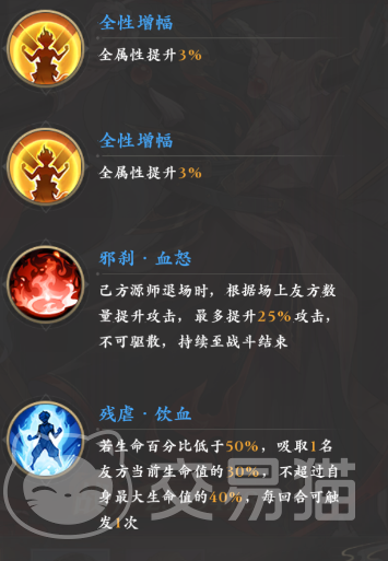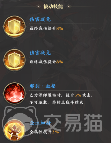 被动方面,范妖首先拥有两个伤害减免,叠加在一起有16%的减伤提升,此外,他的“邪刹·血祭”还可以提升5%不可驱散的攻击,同时随着等级的提升,还能够从被动中额外获取三次全属性增幅。