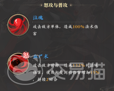 普攻和怒攻这块,前者打的是单体法术伤害,这说明范妖是个偏向法系的英雄,他的怒攻技能也映衬了这点,同样打的是法术伤害,不过会攻击前面一排的敌人,同时加成倍率提升到了132%,而且还会让他们接下来两回合内所受伤害提升15%。