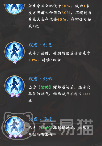 后续的“邪刹·血怒”还可以根据场上队友的数量来提升最多25%的攻击,该效果同样不可驱散,并且会一直生效到战斗结束,通过觉醒还可以获得“残虐”系列的被动,它们能让范妖吸取队友的生命值,也可以让其所受的怒攻伤害减少,同时还会在辅助系源师退场后继承他们的怒气。