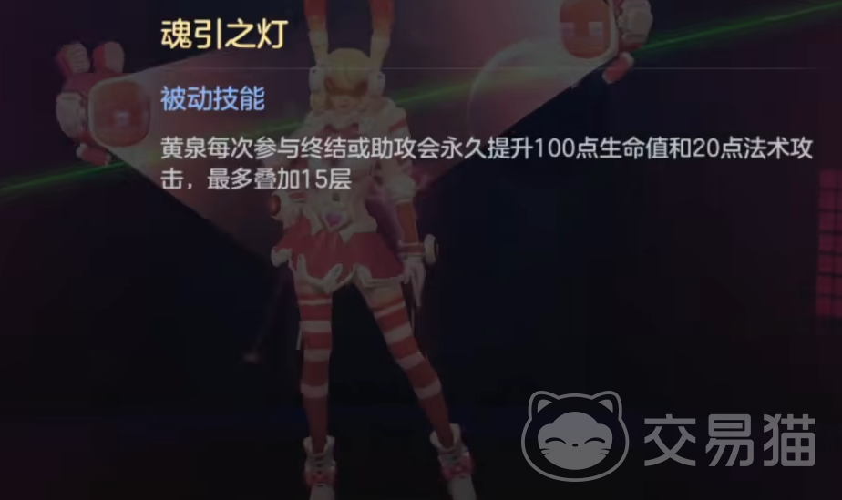 第二位推荐的角色叫做黄泉,这是一位类似法师刺客的法师。也是很适合新人使用的一个角色。黄泉这位角色的背景是取自于上穷碧落下黄泉之意。她本身的伤害不算高,但是其生存能力绝对是满分级别的存在。她自身的被动技能是只要击杀或者参与助攻的话,便会获得65的生命值和15点法强,这个被动效果最多叠加20层。最高1300的最高生命值和300点法强是非常恐怖的一个数值。