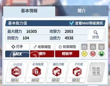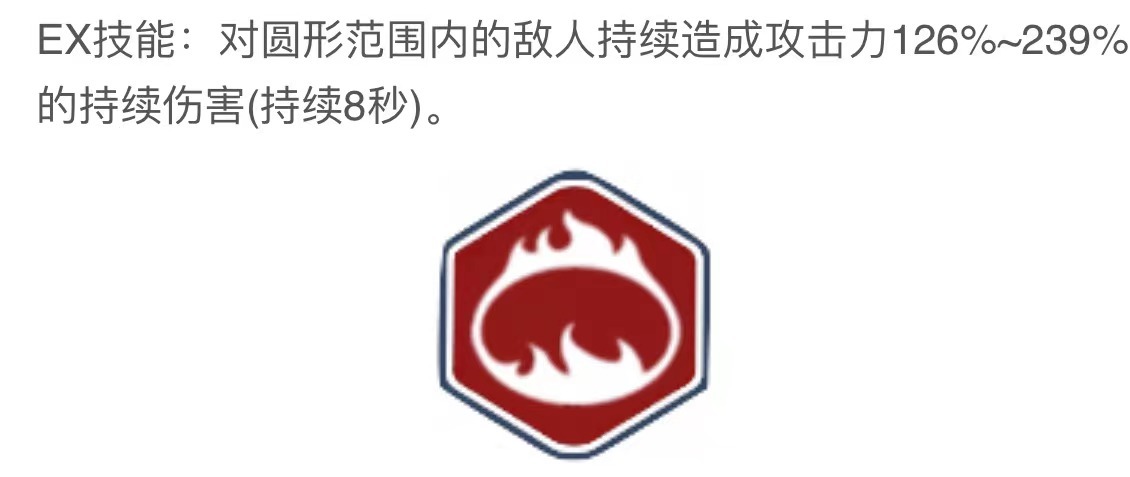 第1个技能ex技能,首先这个技能是一个基础技能,玩家在挑战的时候需要优先把这个技能的材料填补满,这个技能在使用后会对范围内所有的敌人造成239%的技能伤害,而且他的技能伤害会伴随这个技能的升级而提升,不要小看提升过后的伤害,它会给敌人带来持续效果,能够让敌人不知不觉受到很严重的伤害,导致生命值持续下降。