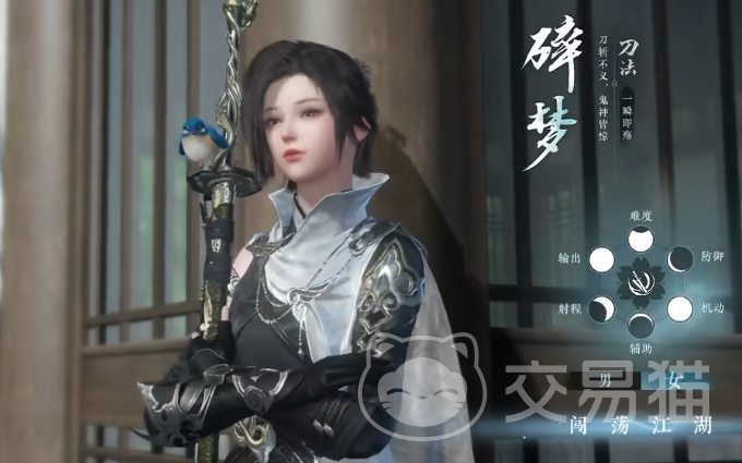 碎梦在游戏中是黑色衣服和被色斗篷的搭配,扎着利落的马尾,刘海是三七分,总体来看是属于非常干练且比较酷的外观设计,使用的武器则是一把长剑,爆发能力是有目共睹的。铁衣在游戏中也是比较犀利、干练的形象,但是这个职业是没有武器的,打击感十足。