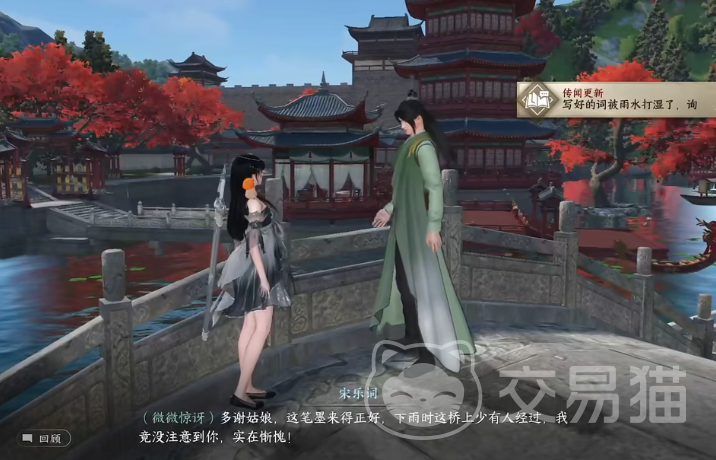 在下雨天大家需要来到虹桥这个位置,找到许峦,并且和他兑换,然后根据许峦的指引来到(1239,1156)这个位置找到一个叫做宋乐词的NPC,并且出示文房四宝这个道具,在和宋乐词的兑换中选择认真想想,这时候NPC就会来到汴京城内的(1071,939)这个位置,大家也来到这里,然后再次兑换,选择建议清唱。