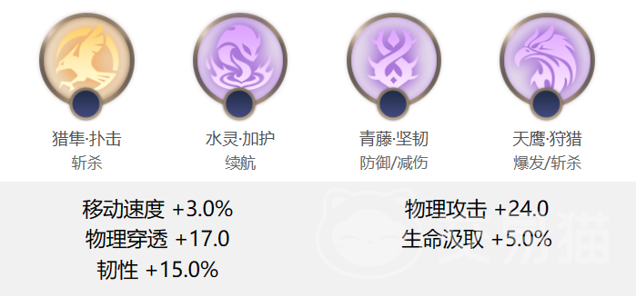 这套星石的搭配方案是“猎隼·扑击+水灵·加护+青藤·坚韧+天鹰·狩猎”,它们可以提供给西施3%的移速,24点攻击,17点物理穿透,5%的生命汲取和15%的韧性,这些属性对于西施来说都是十分重要的,其中高额的攻击和物理穿透可以让她前期刷野和打人都更有效率。