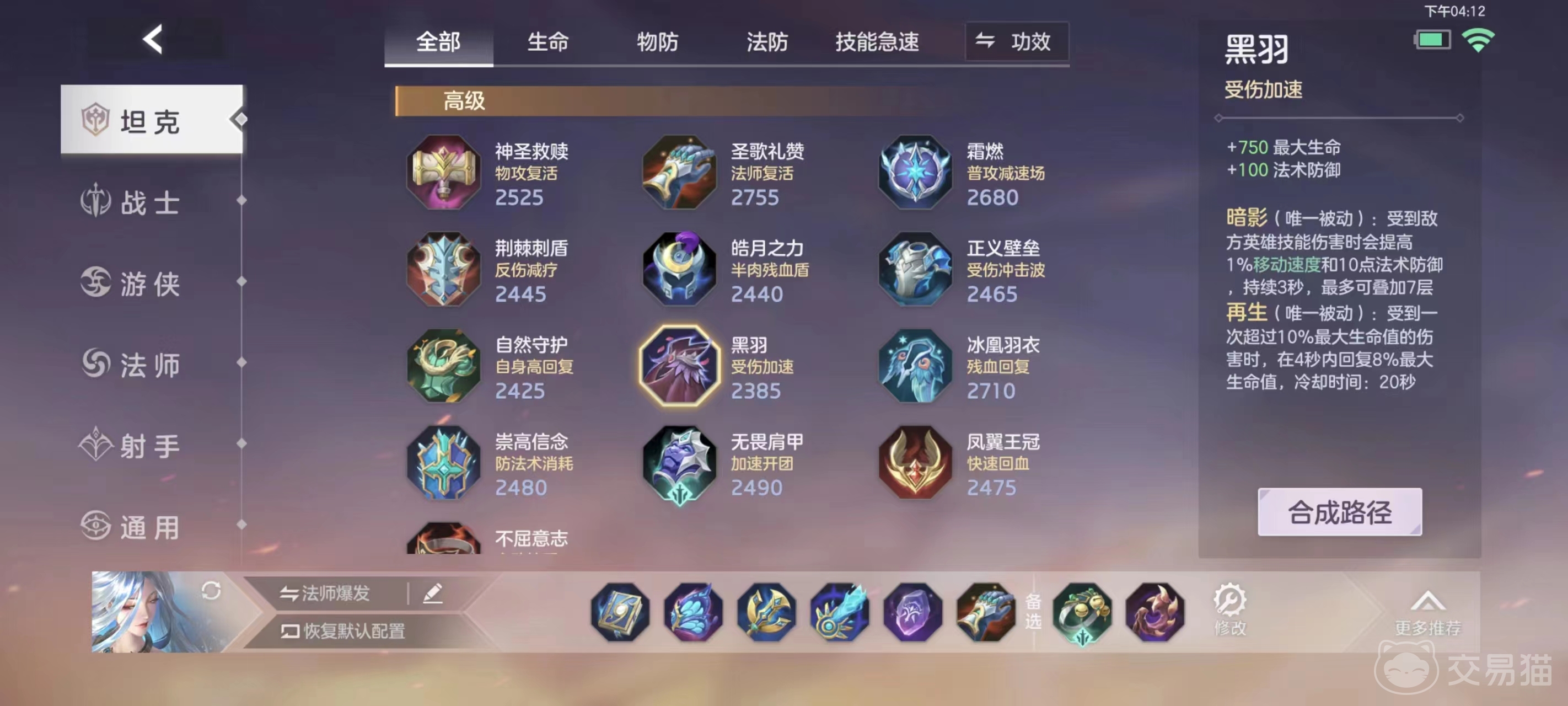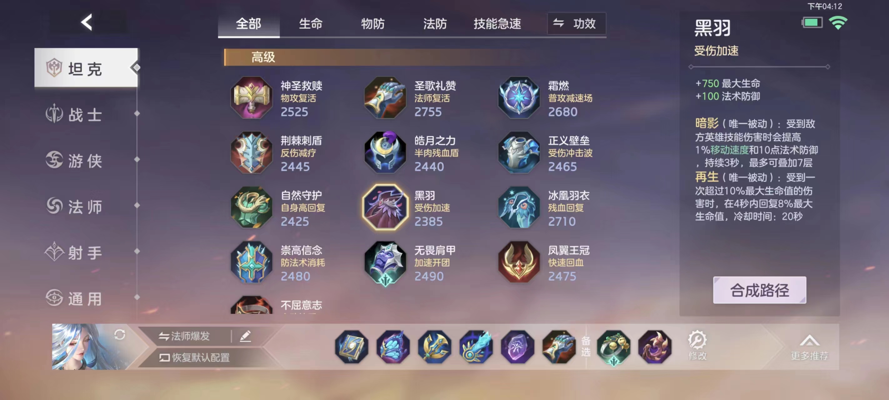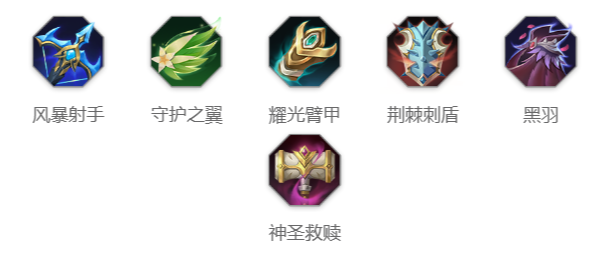 方案二:“风暴射手+守护之翼+耀光臂甲+荆棘刺盾+黑羽+神圣救赎”。这套的话更加偏向于输出,其中风暴射手能提供高达45的技能急速,外加不俗的吸血与攻击力,加上其被动普攻加速的效果,能够让胖达更好的进行追击,然后守护之翼,荆棘刺盾和神圣救赎这老三样还是需要,分别提供了减控,反伤和容错。