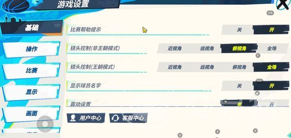就比如基础,在这里大家可以选择是否打开比赛帮助提醒以及王朝模式或者是其他模式镜头控制的视角,还可以自由选择是否展示球员的名字以及是否开启震动模式,在镜头控制这里非王朝模式的话,建议大家玩外线可以优先选择俯视角,玩内线选择近视角。