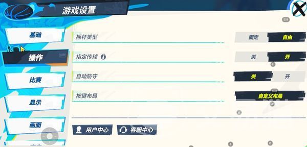 在操作里面,大家可以选择遥感类型,指定传球和自动防护,还可以自定义按键布局哦,在这个页面比较建议大家将指定传球打开,这样在对局中大家就可以传球给指定的队友了,不会随机传,减少操作失误的可能性。