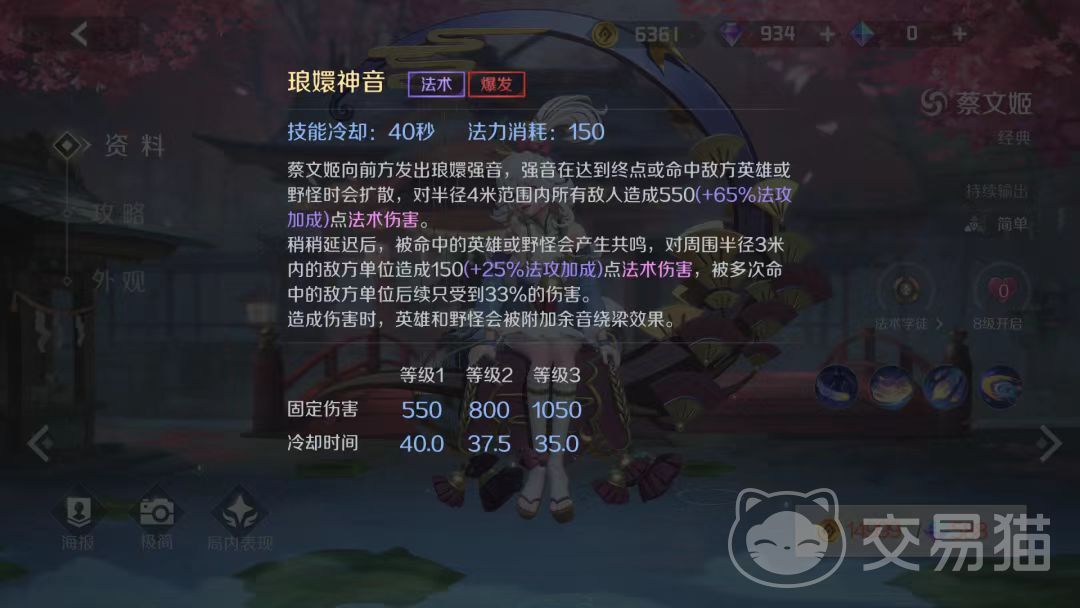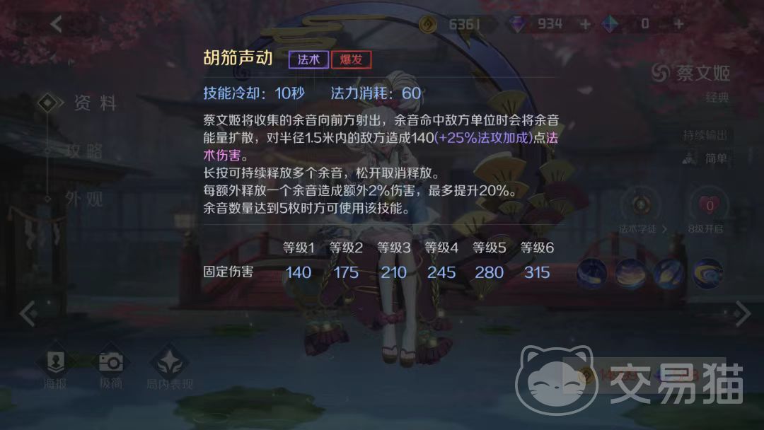 被动技能是余音绕梁,当蔡文姬利用自己的普通攻击攻击敌方的时候不仅会产生一个额外的伤害效果,而且还可能在有限范围里面所有的敌人都会造成伤害,总之,蔡文姬作为一名炮台法师,他的射程范围是比较广的,而且能够带来的伤害也很可观,在团战的时候尽量用它远距离对敌人进行炮射。