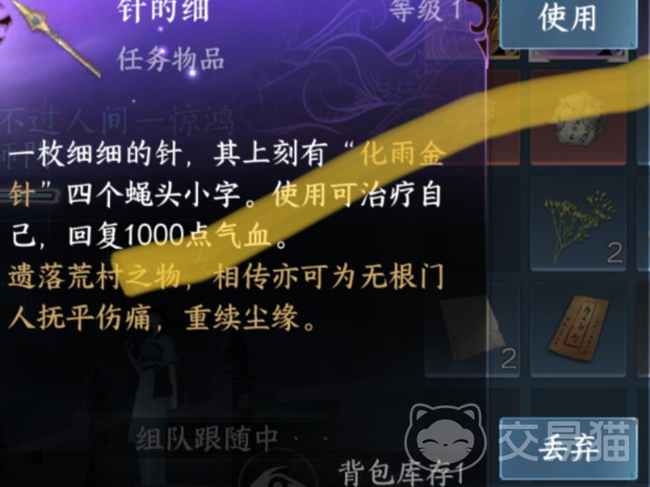 而这个时候,就是要拿着这枚金针,返回杭州西湖,在那座断桥上,再去找那个叫程缘续的 NPC。这一次对话,将会有一个全新的交互模式,那就是让玩家在与 NPC的对话中,有一个选择,那就是把金针交给 NPC,然后就能完成任务。当你做完了这一次的奇遇任务之后,你就可以获得这一枚金针,而这一枚金针就是属于你自己的东西了。