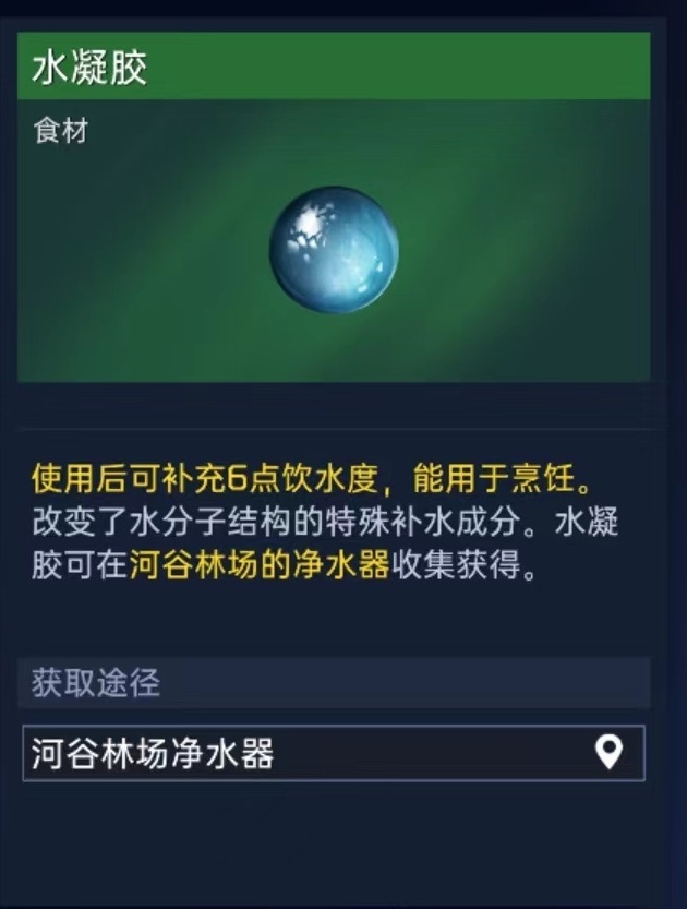 杜加河谷有水培农场、信号监测站、河谷林场,尖叫戈壁有矿场,伊甸城有加工厂、监测站。农场据点可收集纯净水、种子,用于做菜料理。林场中配备了木料合成设备,幸存者可以在此获得木材资源,通过净水器还能得到水凝珠。