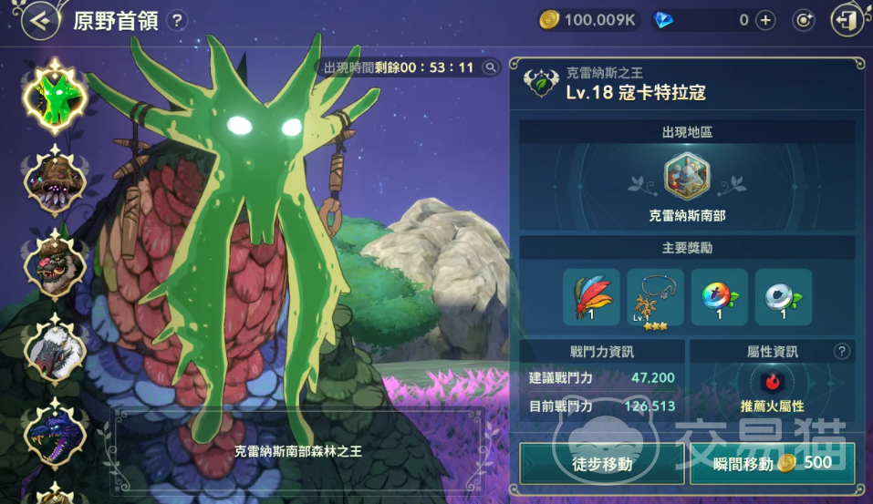 首先是可卡特拉科,它是一个巨大的绿色鸟类,等级为18,出现在克雷纳斯。它的战力入门是47200,推荐属性是火属性。它的主要奖励是套装项链,可以提升我们主属性。打法上要注意躲避它的飞行攻击和羽毛风暴,尽量靠近它的身体攻击,利用火属性对可卡特拉科造成额外伤害。