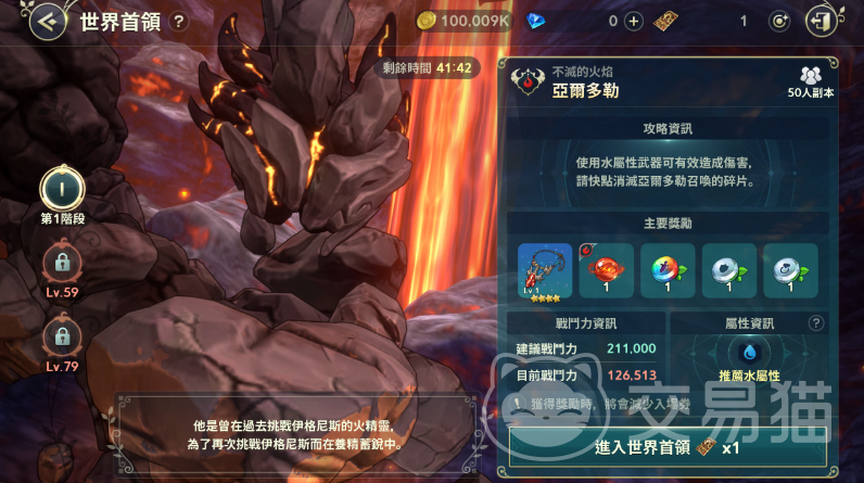 然后是亚而多勒,它是一个红色的石像,等级为64,出现在风之峡谷。它的推荐战力506000,推荐主c是水属性。亚而多勒的奖励套装耳环,可以提升玩家的属性。打法上需要躲开它的高伤害aoe—火焰吐息和尾巴扫击,尽量从远处攻击,利用水属性武器或技能放风筝最稳。