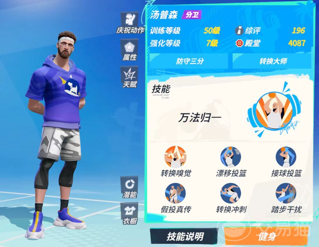汤普森除了在中远距离投篮方面拥有很强的得分能力之外,还能够利用灵活走位跑出空位后,接队友传球直接得分。在外线方面防守能力也不如小觑,号称场上转换大师,能快速从内线到外线进行移动式防守。为了强化优势,小编推荐的是走三分稳定流,选择火力覆盖,不倒翁,多重分身等,这样将三分球能力大大加强,其威胁性更高。