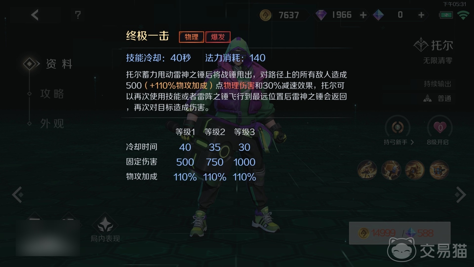 托尔的被动技能一旦触发的话,远的目标单位也就是超过3米的目标会扔出雷神之锤造成37物理伤害,如果近的话直接锤子砸下来锤击目标。1技能加持雷神之锤,获得1次强化的普攻。如果下次攻击是远程攻击的话那么雷神之锤会飞出去并给对方造成120点物理伤害,锤子可以捡回来,如果是近攻的话会召唤闪电来进行轰炸,这个轰炸累计185点物伤。3技能的冲刺可以加一个2s时间的护盾,大招蓄力满了之后直接扔锤字,对沿途上的敌人造成500点伤害和30%的减速,再次使用技能召回锤字再次对沿途目标造成伤害。