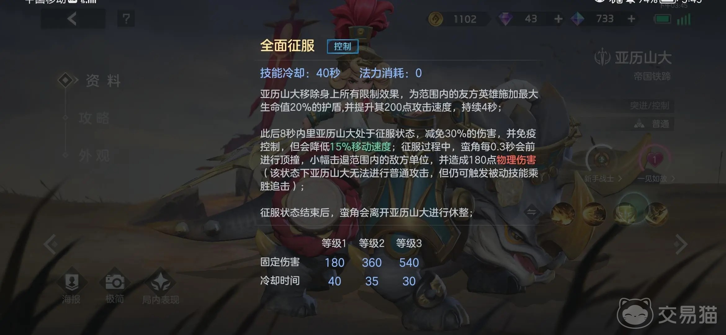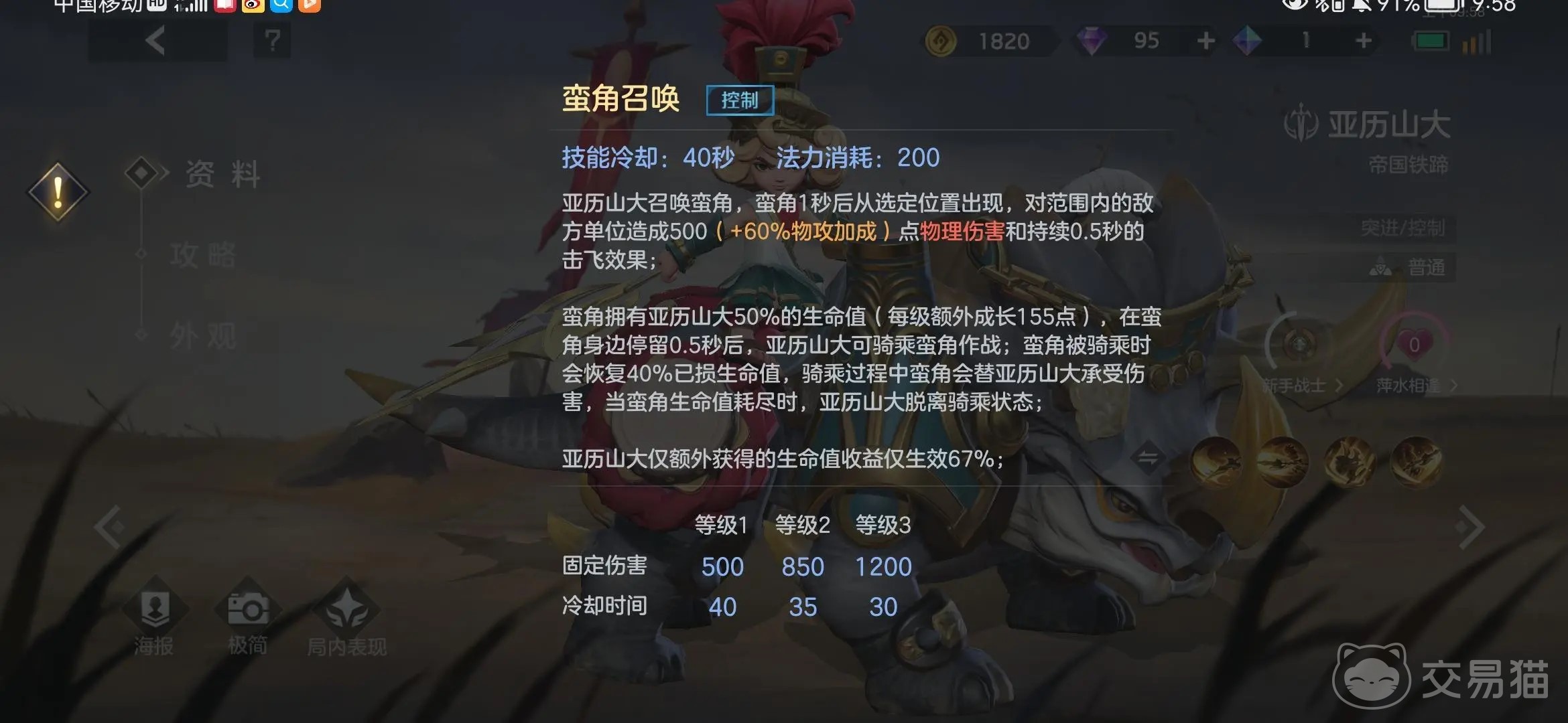 一技能是用来清线和后排输出的,面对对方的第一波兵线就可以用这个技能;在打团时可用二技能,这是个位移技能,可以用来快速贴近敌方后排输出;大招技能是控制技能,是亚历山大的主要开团技能,打团时可以放在敌方后排脚下进行控制,配合打野创造不错的输出。