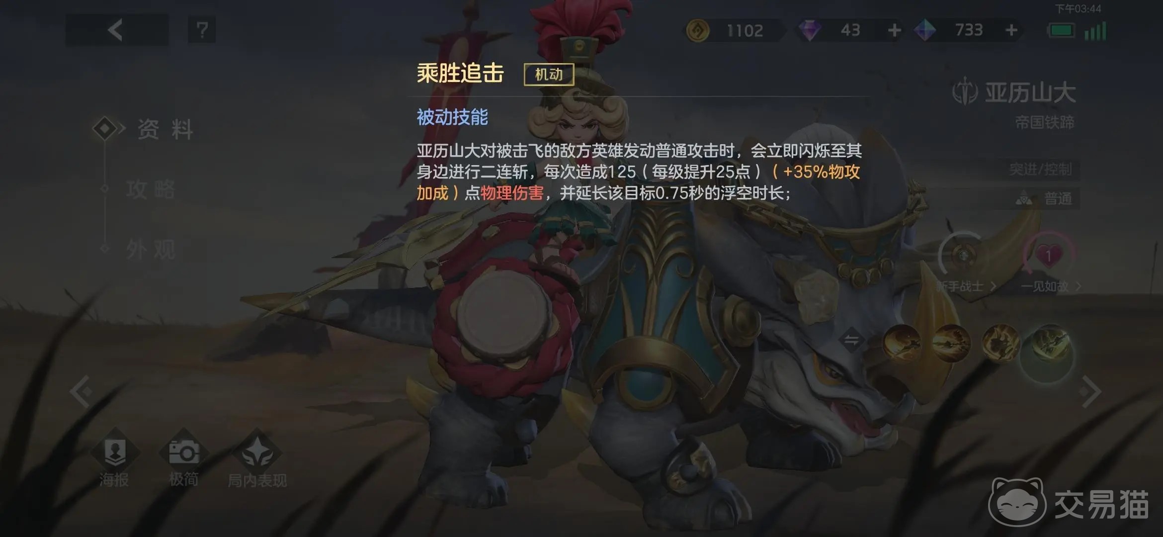 这个英雄的技能分为了步行技能和在骑行状态下的技能。步行的被动技能在被击飞状态下释放,会立即回旋至目标身边进行二连斩,这个技能是这个英雄的主要输出技能同时还能增加击飞的时间。