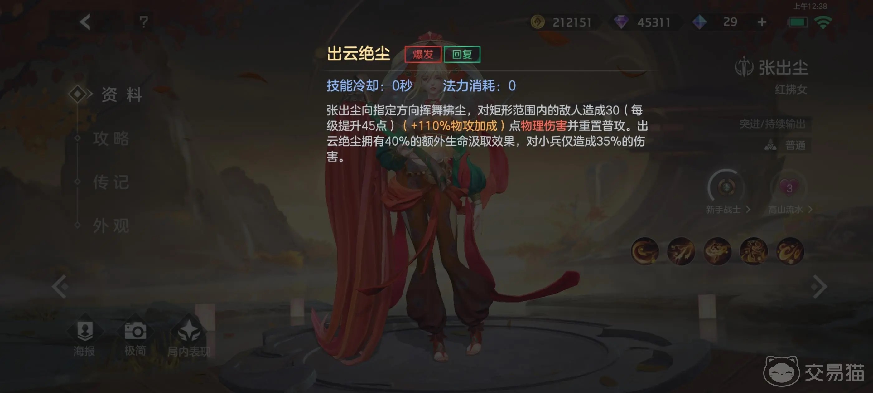 在技能方面,张的被动技能可以无视对方的盾,如果对面对被命中2次将会造成额外25点的伤害并减速2秒,这个减速不能用位移技能来破解。爆发技能对指定方向挥舞拂尘,对矩形范围内的敌人造成30(每级提升45点)(+110%物攻加成)点物理伤害并重置普攻。出云绝尘拥有40%的额外生命汲取效果,对小兵仅造成35%的伤害。