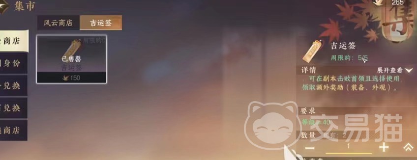 如果说并没有完成任务的话,那么玩家也可以通过在风云商店中购买集运签来兑换羽毛道具,同样也可以在商店中获得想要的物品,集院签的数量越多,兑换的羽毛道具的数量也会变得更多。