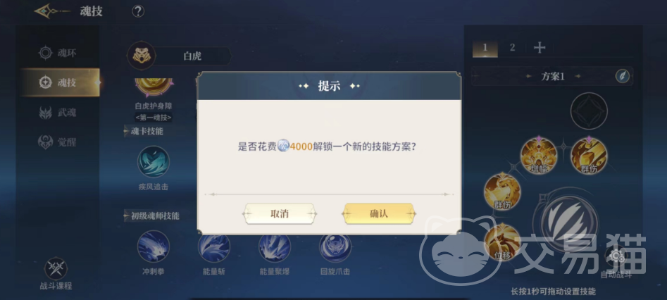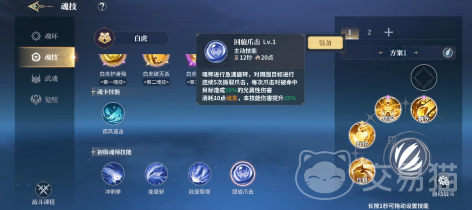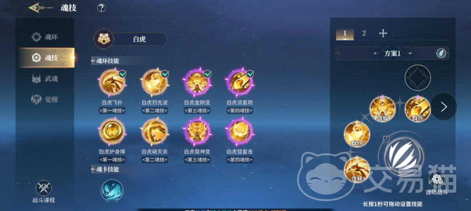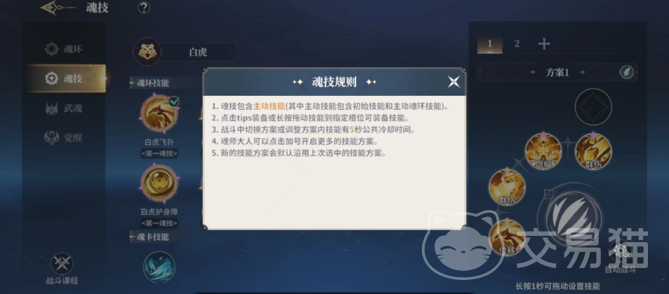 对战中大家可以上阵的除了普攻之外还可以装配四个技能,而方案上面大家还可以花费一定的一定的魂币去解锁方案,在战斗的过程中大家也是可以切换方案使用技能的,不过每一次切换之后有5秒的冷却时间,大家可以依靠这个方式来缩短攻击的间隔时间。