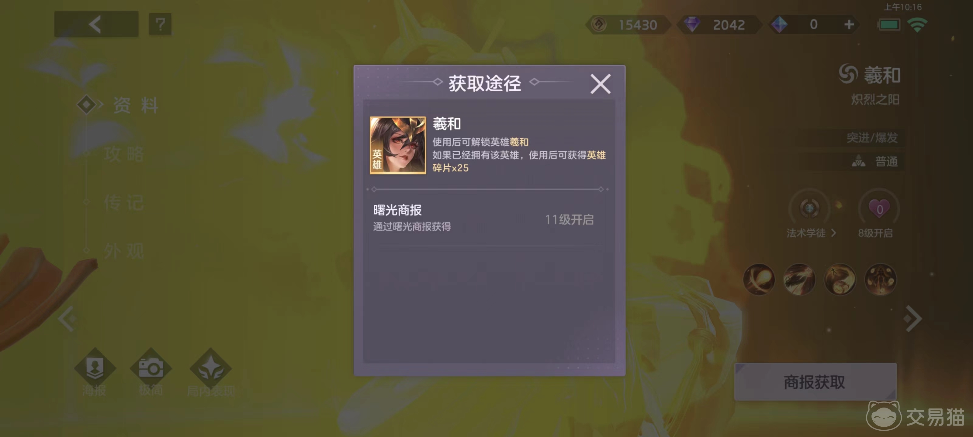 商报中需要通过特定的货币兑换其中的物品,羲和的英雄碎片也包含其中,只需要集齐一百个碎片就可以兑换羲和这个英雄,不过需要注意的是商报中的物品并不是固定的,它本身会每隔一段时间进行一次刷新。