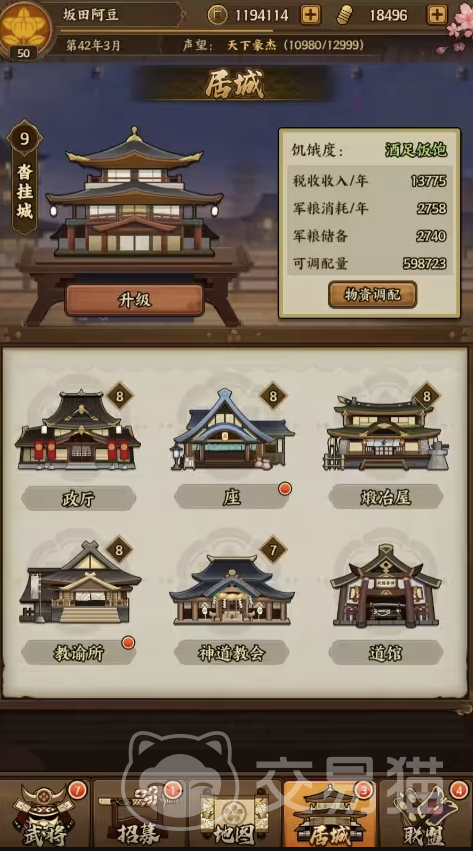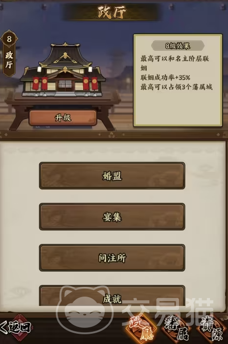 婚盟玩法是有解锁条件的,玩家需要将居城政厅的等级提升到2级才能解锁婚盟玩法。这个玩法的参加方式非常简单,玩家只要将自己的武将等级升到武士就可以了,当然,旗本也可以。另外,升级的地点是在二条城。