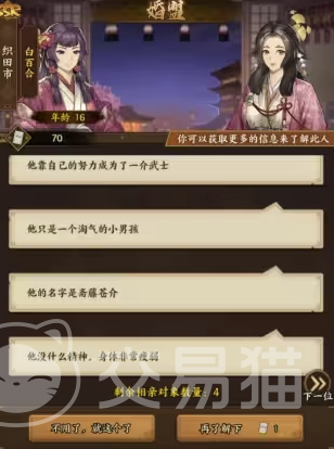 玩家在选择婚盟前,可以查看武将的特性。这个属性查看非常方便,可以直观看到角色的天赋以及特性。当然,玩家能看到的武将信息并不是百分百全面的,只会给出部分描述。想要查看全部信息,需要玩家选择加入婚盟才行。这样设定的好处就是让游戏的婚盟系统有着更高的可玩性,玩起来不用那么功利。