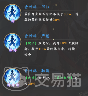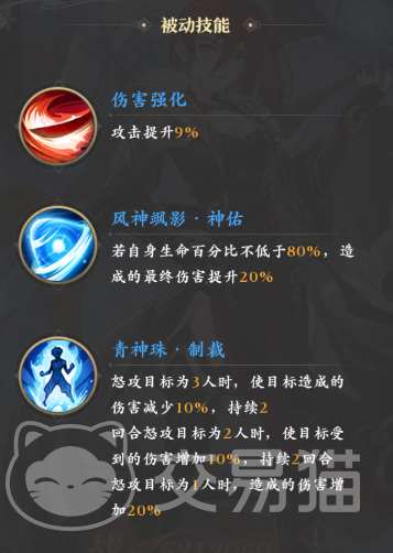 接着郗菁还凭借被动吃到了三个攻击力提升的效果,提升幅度累加在一起有24%,后续的又一个特有被动“风神飒影·神佑”则可以在高血量时提供给郗菁额外20%的伤害,通过觉醒所获得的四个“青神珠”系列被动则提供了减少敌人伤害,增加敌人所受伤害,自我增伤,破防,暴击和属性提升等多重效果。