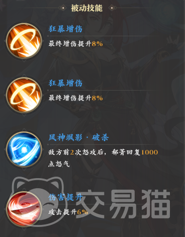 被动技能这块,首先郗菁有两个8%的最终增伤,后续她还可以凭借特有的被动“风神飒影·破杀”来在敌人前两次怒攻后,回复足足1000点怒气,对于启动速度的提升可谓十分明显了。